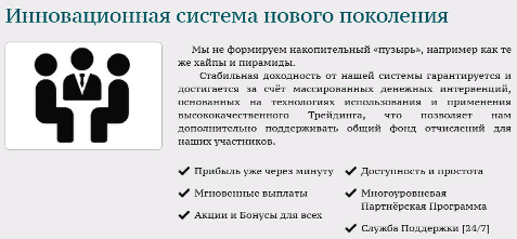 За счёт систематического использования лучших продуктов инвестиционного рынка и применения высококачественного Трейдинга проект получает и реализует очевидные перспективы дальнейшего роста. Это даёт системе огромное преимущество на рынке и возможность гарантировать стабильную доходность за счёт дополнительного подкрепления самой системой общего фонда отчислений.